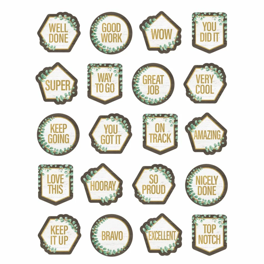 These leafy, wood-grain inspired stickers with positive sayings are acid-free and lignin-free. Measure approx. 1″ square or round. 120 stickers per pack. Shop the full Eucalpytus collection for a complete classroom oasis.