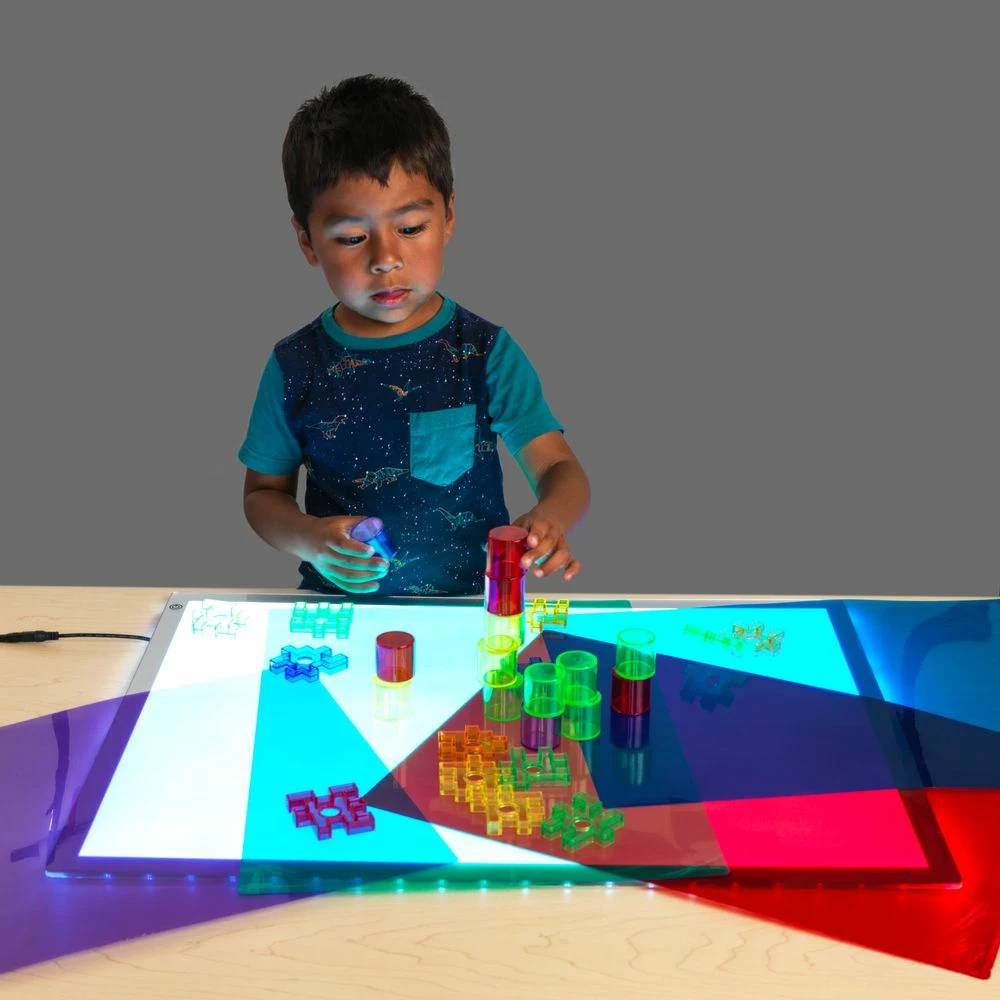 These Excellerations® Colored Overlays for Light Panels come in six different colors and are usable on any flat surface. They are ideal to use on light panels or light tables. This is an ideal way to change the color of your lit surface at an economical price. Use with translucent items to create additional visual experiences.