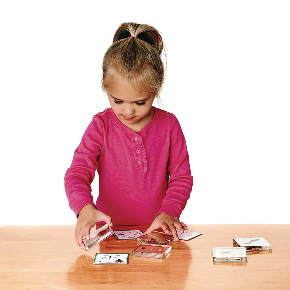 Kids are fascinated by bugs! The 5 transparent resin tiles feature real insects in different stages of development. Measuring 3 inches x 3 inches, slides show the 3 or 4 life cycle stages of each insect. Specimens include; cabbage butterfly, dragonfly, frog, honeybee, and mealworm and each has an educational card with images and fun facts for each specimen.