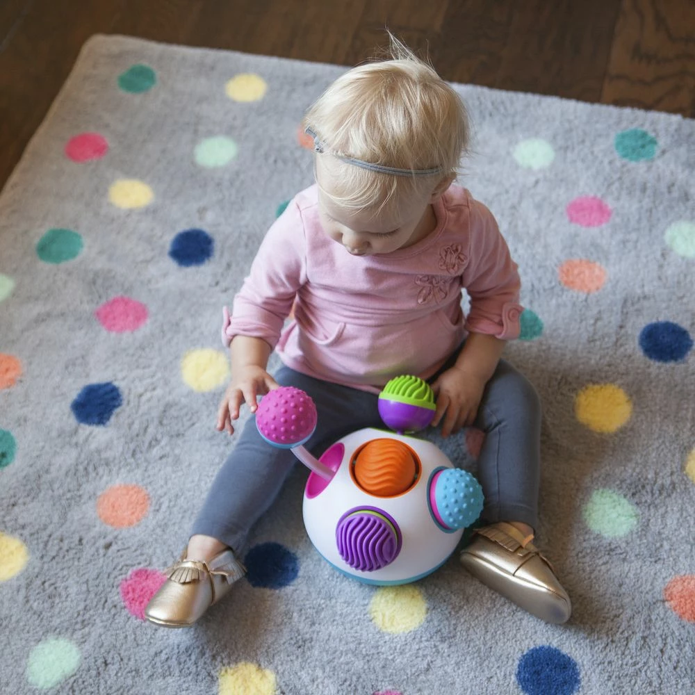 - INTERACTIVE PLAY: Push the pink ball and the blue ball is pushed out; green and purple knobs click in and out; orange and teal ball on top spins around and around. The soft rubber tops feature vivid textures and each ball is filled with rattling beads and spins around and around.