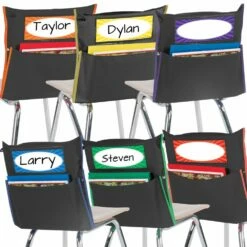 - CLASSROOM ORGANIZATION: This pack includes 24 grouping chair pockets in chic black with color coded piping with 24 name tags. Pack includes 4 of each color blue, red, yellow, orange, purple, and green. Really Good Stuff Grouping Chair Pockets help students organize their materials and maximize desk space and allow you to color-code groups for easy classroom management. They offer a roomy gusseted pocket, clear plastic sleeve which hold a replaceable name tag, and a sturdy loop for hanging. Choose a style and color that best fit your needs and classroom.