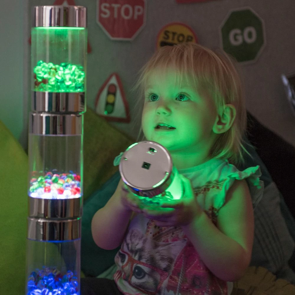 An engaging set of six metallic cylinders with illuminated contents for rolling, shaking, stacking, and turning. The shakers light up when switched on and provide an engaging and multisensory experience. An attractive docking station charges them and provides easy self access. Docking station measures 11″ L. The roller stays on the chosen color when it is turned on/off. They take 4 hours to fully charge and last approximately 5-6 hours. Wipe clean with a damp cloth, do not submerge in water.