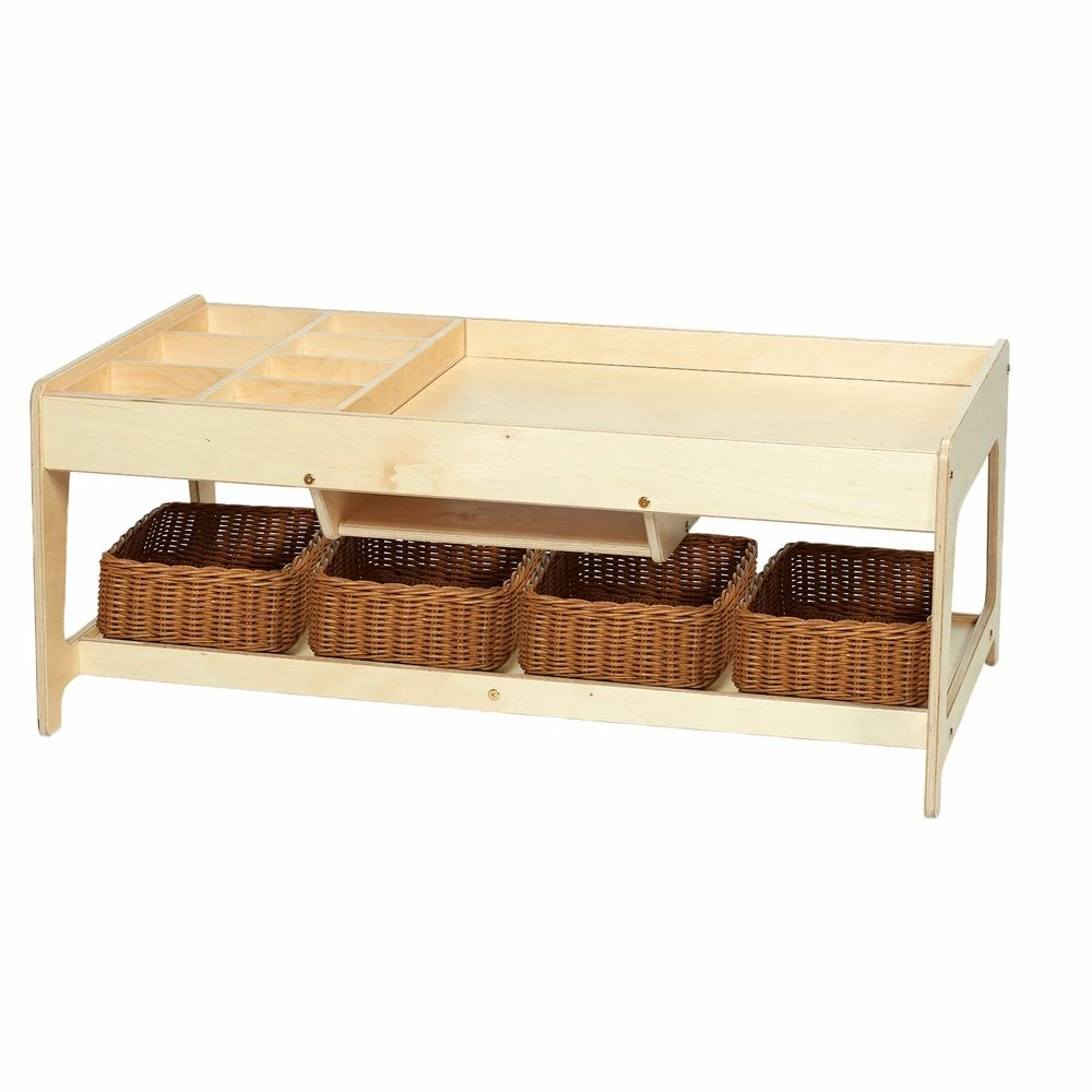 A unique storage solution and play surface combination that offers maximum versatility for sorting and organizing math, loose parts, small world and transient art resources. The play table includes 4 shallow baskets and a movable sorting tray that can be positioned as required on the table surface. When not in use, the sorting tray has its own storage cubby on the underside of the table.
