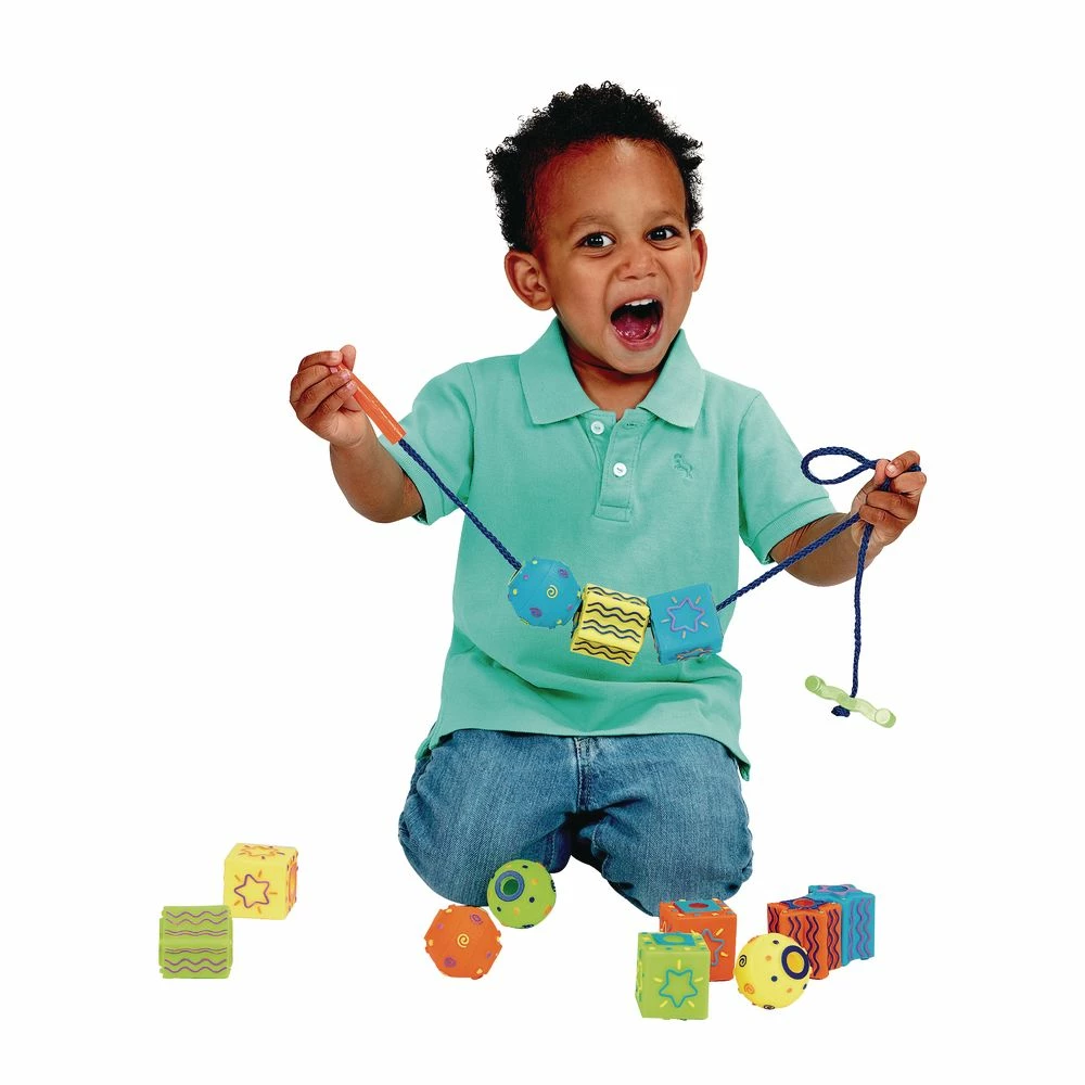 Lace-A-Shape features 12 big soft lacing beads that are easy for little hands to hold and thread.