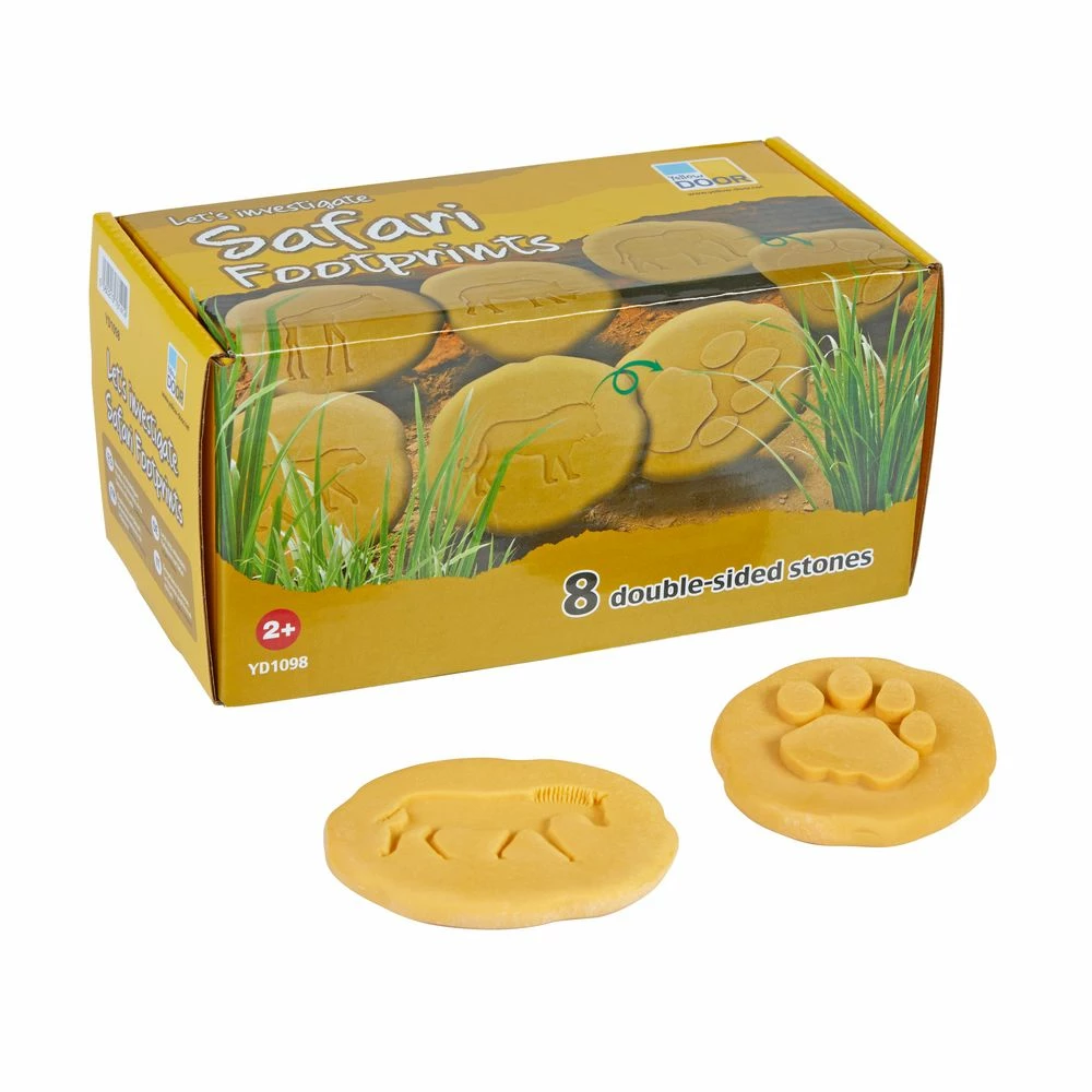 Take a walk on the wild side and explore what animals you might find on the African savanna as you follow their tracks. Each stone has a raised footprint on one side and the related creature in relief on the other. Watch out for the following animals: lion, elephant, rhinoceros, giraffe, hippopotamus, ostrich, cheetah and zebra. Made from a durable stone and resin mix, the footprints can be used in sand, water and soil, and are easily washed clean for a new adventure. Contains eight double-sided stones measuring approx. 3 inches.