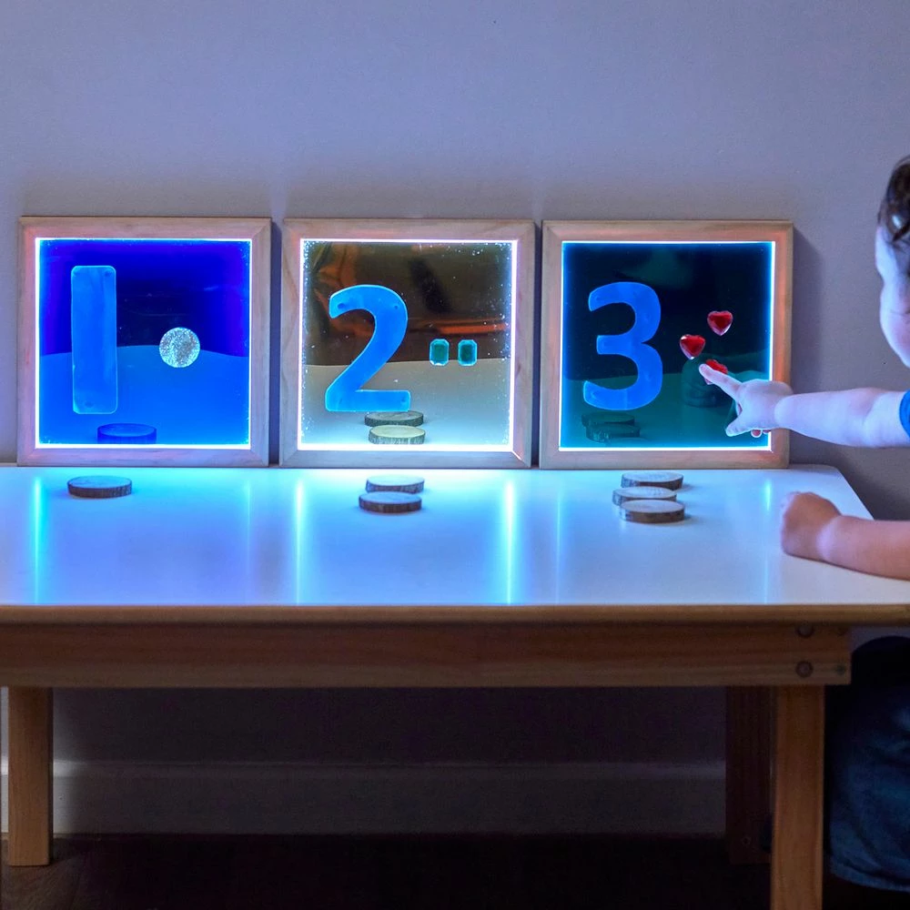 A set of 3 beautifully illuminated acrylic mirrors to add extra awe and wonder to your environment. The mirrors are in three colors, blue, green and gold. They can be used on tabletops, floors or attached to walls. Use them to peer into or as a surface for all kinds of scenarios, from counting to small world locations. Place a mini scene on the surface or use them for transient art. These mirrors are really versatile and engaging. Simply add batteries and then press a switch to make the light around the mirrors glow! The mirrors can be placed in a calming, darkened environment and can be calming for some children.