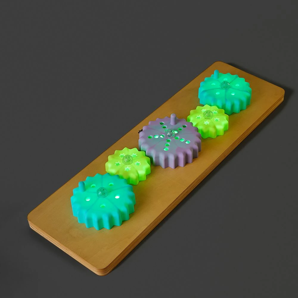 Children will love interacting and making discoveries with this wooden board, with cogs that light up and change color when rotated. A great stimulus-response resource that incorporates fine motor skills and hand-eye coordination, while providing a way of developing early ICT skills away from screens. The board can be used on tabletops, floors or fastened to the walls.