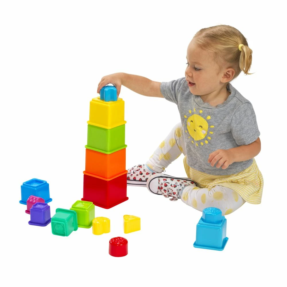 Children will have hours of stacking fun while learning new shapes, colors, animals and more with this fun take on stacking blocks. Set includes 10 blocks that stack upwards and into themselves and 6 different shape blocks with fun animals that match the blocks. For children ages 12 months and older.