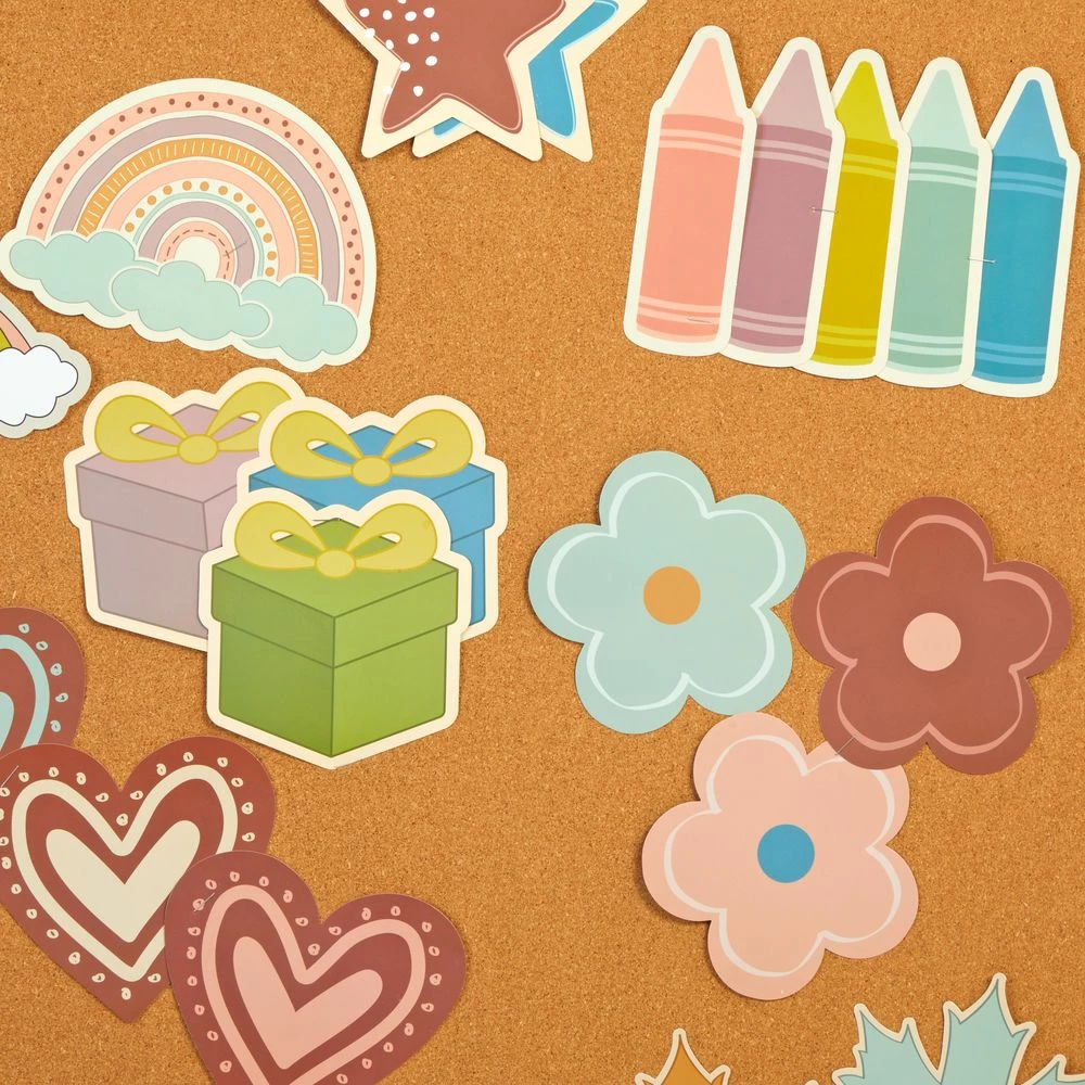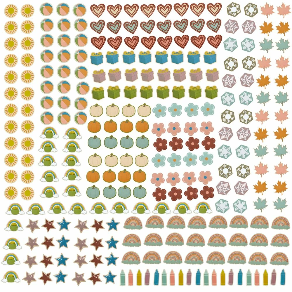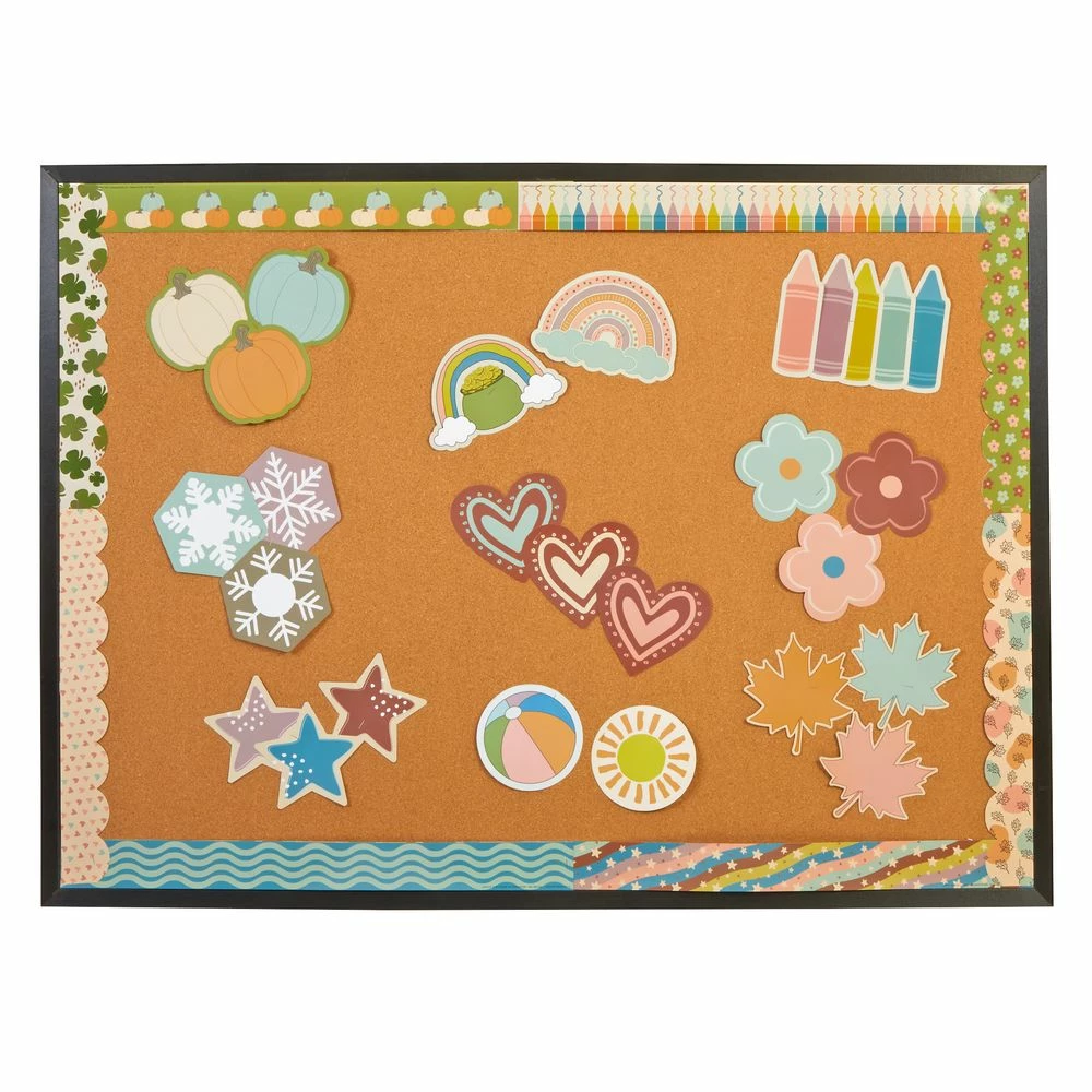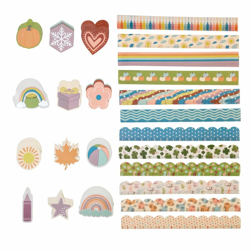 Share student work in style! Create a fresh look in your classroom with this 432-piece set of double-sided bulletin board borders and accent pieces. Each month has 12 themed border pieces and 36 die cut accent pieces. These durable accents can be customized with permanent marker to fit your classroom needs. Choose from two different themes – Boho or Cool and Calm by just flipping the double-sided pieces over! Display student work, artwork, or writing in a fun visual way! These durable accent pieces include snowflakes, hearts, pots of gold, rainbows, flowers, suns, starts, beachballs, crayons, pumpkins, leaves, and gifts.