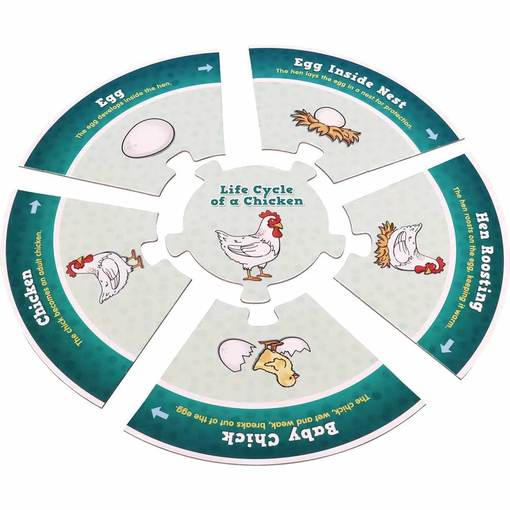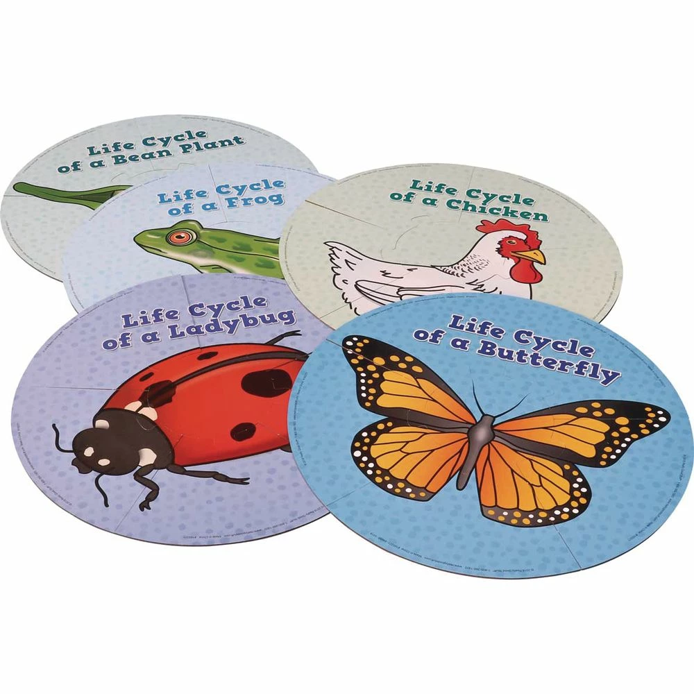 As students complete these circular puzzles, they learn about the life cycles of a butterfly, frog, chicken, ladybug, and plant. The back of each self-checking, six-piece puzzle has an illustration of the fully grown animal or plant.