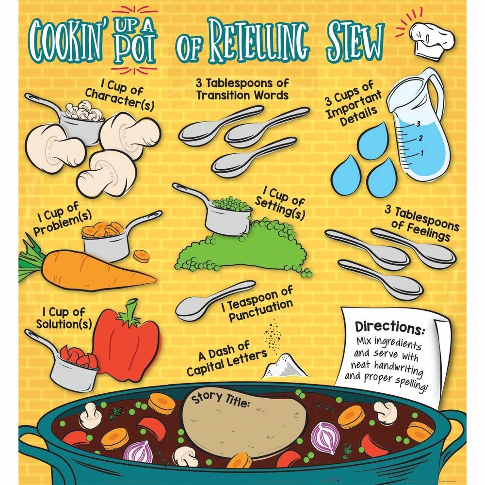 Put the three banners together to create a big, easy-to-see, write on/wipe off poster where you and your students can record the essential parts of a story summary. After filling it out as a class, the poster works as a handy reminder for students when they write their individual summaries.*Large Format Is Easy To See: Put the three 12″ by 39″ banners side by side to create one big 36″ by 39″ poster that can be seen throughout the classroom.*Fun Format Helps Kids Remember: The poster helps young writers look at retelling as if they are making a pot of stew. It lists all the key “ingredients” they need to include in a good summary.*Write-On/Wipe-Off: The Write Again wipe-off laminate surface not only lets you write on this poster with dry erase marker and wipe it off later for reuse, it also adds durability. You can use this helpful writing tool all year long and year after year.Help young writers sharpen their story summarizing skills with this jumbo, write-on/wipe-off poster in a fun format.