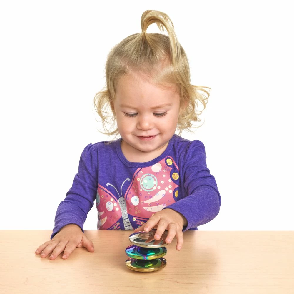 - FOSTER DESCRIPTIVE LANGUAGE: These smooth, sensory disks reflect images and colorful effects, which encourage children to question what they see. They’re an enchanting observation tool for indoor play