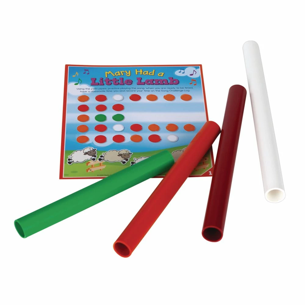 1 – instruction card; size 8″ x 10″ * 1 Vocabulary card; size 8″ x 10″ * 5 song cards * 10″ x 8″ * 8 color coded pipes * varying sizes * 4 Page Repro * 11″ x 17″ * 1 hanging plastic bag * Size: 11″ by 13″
