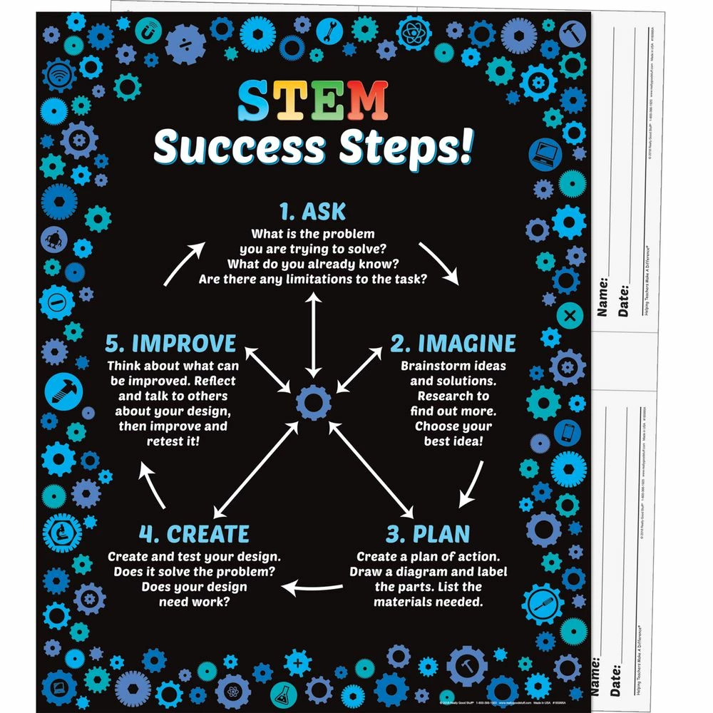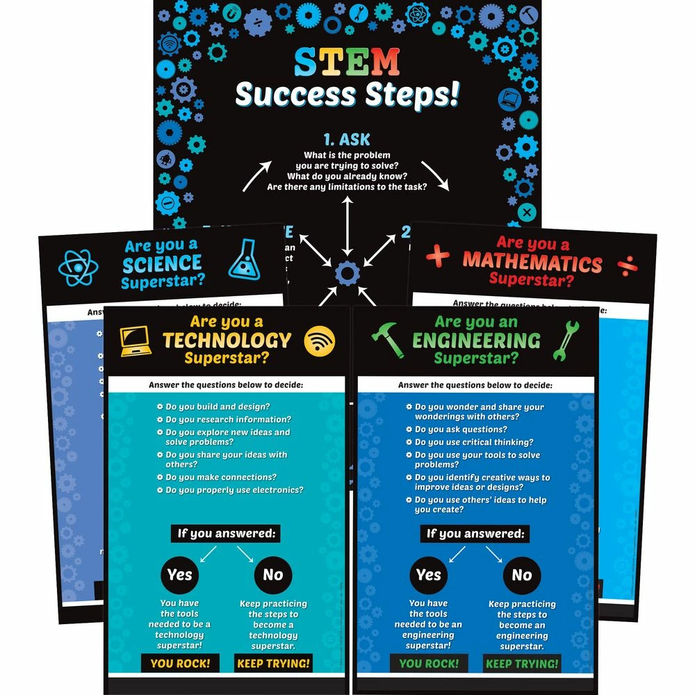 This poster set introduces the STEM process and generates enthusiasm for each aspect of STEM: science, technology, engineering, and math. The main poster takes the class through the steps in the STEM process, while the smaller posters help students see how they can personally relate to each area of STEM. The backs of the posters offer ready-made reproducible worksheets (less work for teachers!) plus certificates to motivate and reward students.