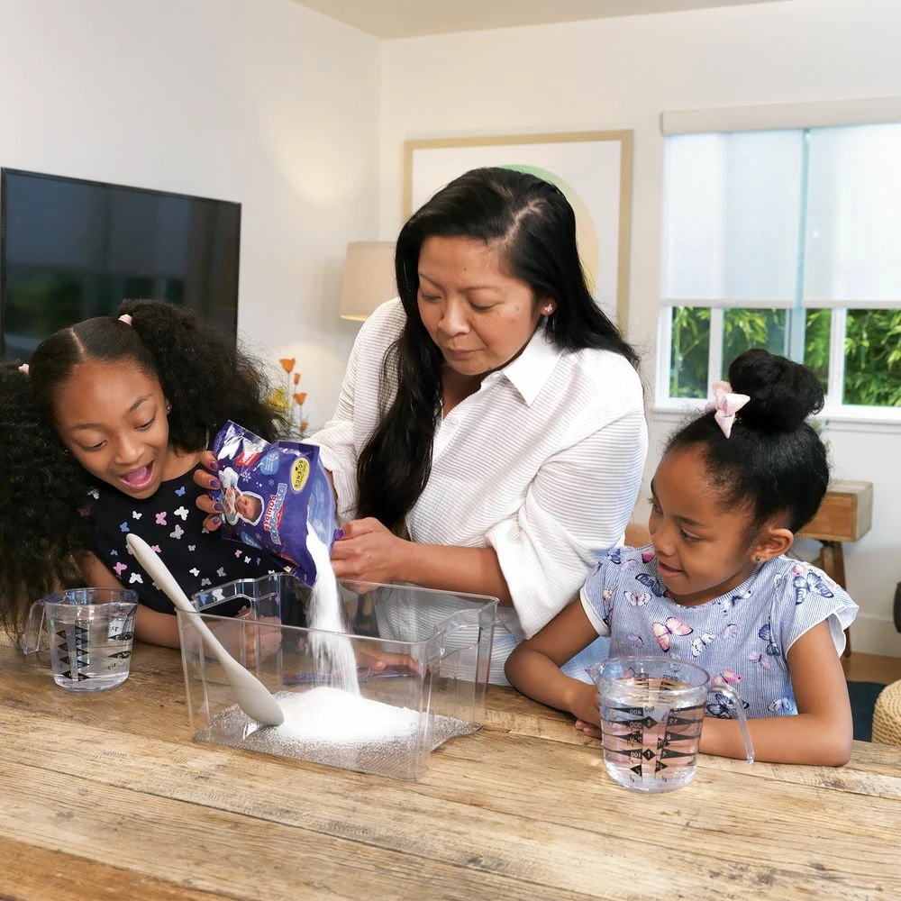 - Just add water to make gallons of white fluffy snow in seconds!