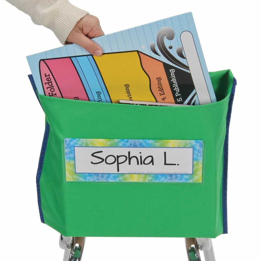 - CLASSROOM ORGANIZATION: This pack includes 6 store more deep pocket chair pockets with 6 name tags. Really Good Stuff Store More Deep Pocket Chair Pockets help students organize larger materials and maximize desk space with an extra deep pocket. They offer a roomy pocket, clear plastic sleeve which hold a replaceable name tag, and a sturdy loop for hanging. Choose a style and color that best fit your needs and classroom.