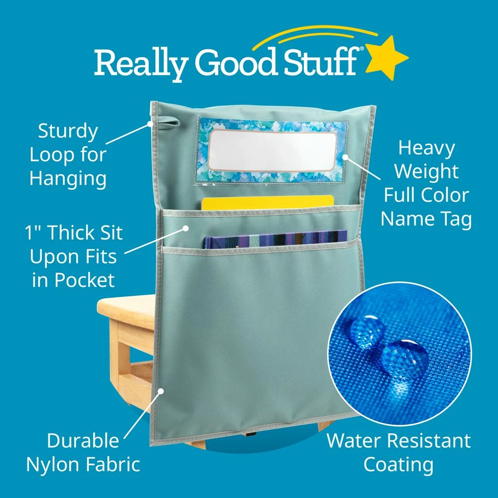 These calm colored chair pockets won’t take up any extra room and will allow students to store books, folders, AND sit-upons on the backs of their chairs, freeing up space inside their desks or tables and around the room. You get 6 nylon chair pockets in our light blue color and 6 blue sit-upons. Each chair pocket measures 15″W x 19″H, with 2 large pockets. The inside width is 14.25″, and the back pocket is 13″ deep, while the front pocket is 11” deep. The chair pocket also comes with 9.75″ x 3.5″ name tag. Each sit-upon is made of nylon and 14” x 14” and 1” thick. Our durable chair pockets are made of strong, woven nylon fabric designed to withstand whatever your students can dish out. Spot clean with soap and water. Each chair pocket features roomy pouches for books and supplies, a stitched-on loop for hanging, and a clear sleeve to display the name tag (included)! Each sit-upon is made of durable nylon and over an inch of thick foam. They are also fire retardant and washable. Each sit-upon has a sturdy handle stitched on, so you can hang them up at the end of the day. Great for reading time or flexible classroom. Research has shown that cool and calm colors allow students to maintain higher focus levels. If you want to create a cool and calm color scheme in your classroom, these chair pockets and sit-upons will be the perfect addition.
