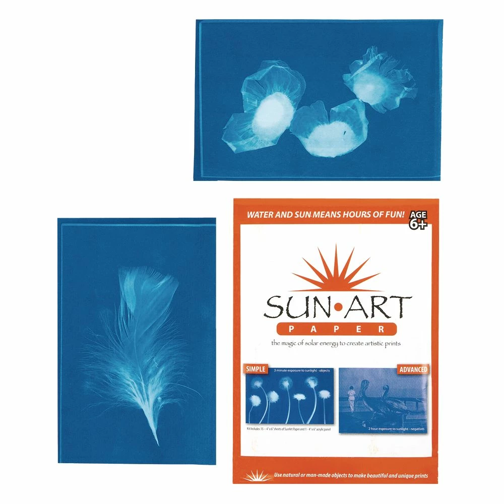 Place an object on the Sunprint® paper and leave it in the sun until the paper turns white. Quickly rinse the paper with water for about a minute and dry flat. Your print will appear like magic!